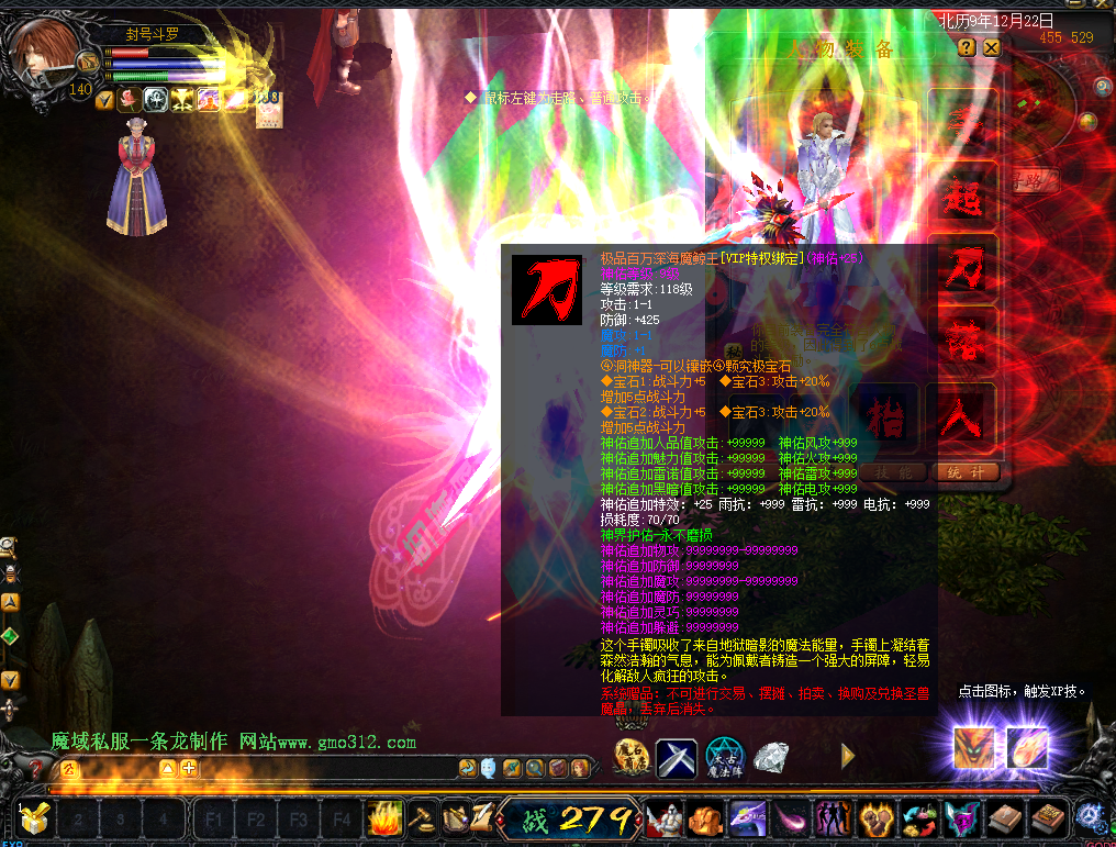 新人上线VIP7:魔魂+255战魂+9全属性(地水火风+8)装备